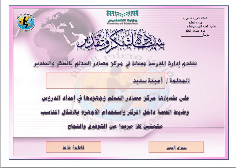 الحازمي لخدمة أمين مركز مصادر التعلم شهادات شكر لمعلمات المتميزات